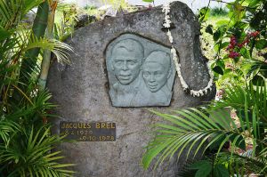 En 1969, Jacques Brel met un frein à sa carrière de chanteur et décide de partir vers d’autres aventures, cinématographiques entre autres. En compagnie de son amie Maddly Bamy, le chansonnier belge traverse mers et océans pour effectuer le tour du monde sur son voilier, l’Askoy. En novembre 1975, le grand Jacques accoste sur les rives d’Hiva Oa, une île située dans l’archipel des Marquises. Maddly et lui s’établissent à Atuona, le chef-lieu de l’île. Brel s’amourache rapidement des lieux et des habitants et, grâce à son avion baptisé Jojo, il effectue différentes missions humanitaires; le chanteur installe aussi à ses frais un cinéma pour les enfants de l’île et aurait même donné un coup de main lors d’accouchements ! Mais malheureusement pour lui (et pour nous), un cancer lui ronge les poumons et, après un bref passage à Paris où il enregistre dans un dernier souffle ce qui s’avérera être ses dernières chansons, Brel décède en octobre 1978. Son corps sera rapatrié aux Marquises, et il sera enterré au cimetière du Calvaire… à deux pas de Paul Gauguin.