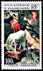 Le peintre Paul Gauguin s’installa dans l’île à la fin du 19e siècle, où il consacra ses dernières énergies à quelques portraits dépeignant la vie dans l’archipel. Parmi ceux-ci, il y a le tableau Le Cheval Blanc (que l’on peut apercevoir sur le timbre, un peu plus haut), créé en 1898 lors du deuxième séjour du peintre à Tahiti. Cette peinture semble avoir inspiré Brel, puisque dans sa chanson sur les Marquises qu’il venait de quitter, il ajoute :