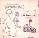 Le vent de contestation des années 60 ne souffle pas sans effet et bientôt la France vivra un mois de mai plutôt agité. Pendant ces évènements, Évariste ne reste pas coi et laisse ses mathématiques tant prisés de côté pour composer des pièces plutôt politiques. Son prochain 45 tours – dont la pochette est signée par Wolinski – ne contient que deux titres, mais assez évocateur: La révolution et La faute à Nanterre. Cet album a une certaine importance dans l’histoire de la chanson française: non seulement est-ce un des premiers disques auto-produits en France, mais il sera également le catalyseur d’un autre chanteur contestataire. En effet, le texte de La révolution sera tapé à la machine par un certain Renaud Séchan…